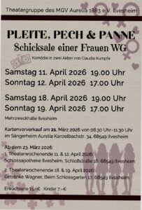 Bei der Theatergruppe des MGV Aurelia laufen die Proben gerade auf Hochtouren. Die Laienschauspieler befinden sich mittlerweile auf der Zielgeraden zur Premiere des Stücks „Pleite, Pech und Panne – Schicksale einer Frauen-WG“, eine Komödie in drei Akten von Claudia Kumpfe. Die Premiere ist am Samstag, 11.April 2026 um 19h in der Mehrzweckhalle in Ilvesheim. Für …